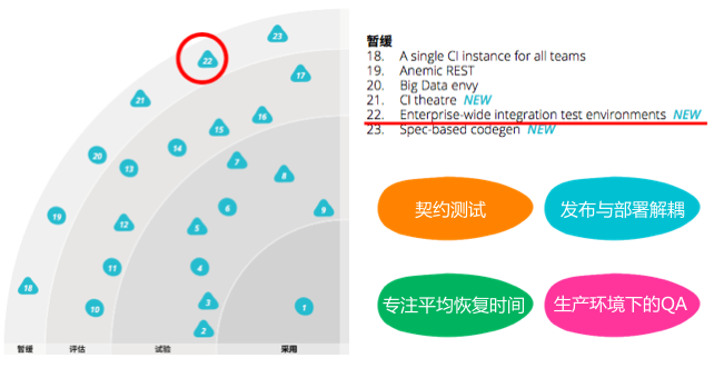 集成测试成为了持续交付的瓶颈,犹如鸡肋。因此,最新一期(2017年第16期)ThoughtWorks技术雷达建议企业暂缓搭建企业级集成测试环境,而是采用增量的方式发布关键组件到生产环境。增量发布涉及到一些重要的技术包括契约测试、将发布与部署解耦、专注于平均恢复时间和生产环境下的QA 。
