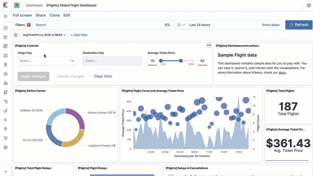 ELK里的Kibana是专门针对Elasticsearch的图形化操作工具,能够对Elasticsearch的数据进行检索,也可以将结果图示化展现。如下图示: