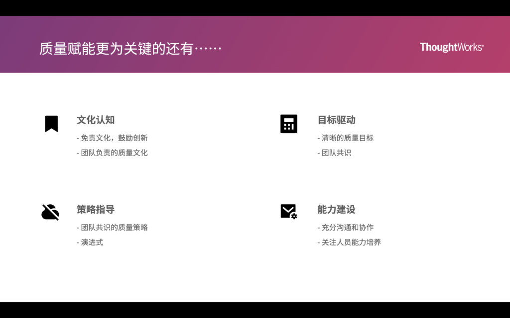 - 文化认知、质量策略、人员能力不能成为质量赋能路上的绊脚石。