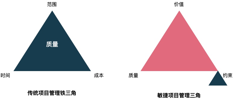 Jim Highsmith提出了敏捷项目管理三角,价值和质量是目标,各占一角,传统三角组合变成“约束”占据第三角。敏捷管理三角不仅进一步强调了质量的重要性,更是强调了质量的不可妥协性。这就表明如果因为某些因素影响到了交付需要提速的情况下,也不能以牺牲质量来实现,应该调整的是范围。
