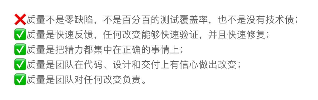 ❌Quality is not zero defects, not 100% test coverage, and not the absence of technical debt. ✅Quality is fast feedback, ensuring that any change can be quickly verified and repaired. ✅Quality is focusing energy on the right things. ✅Quality is a team having confidence in making changes to code, design, and delivery. ✅Quality is a team taking responsibility for any changes.