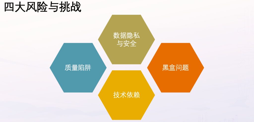 当然,测试小伙伴们,也不用太焦虑。AI还没那么成熟,还是存在很多风险与挑战的,主要有以下四类:数据隐私与安全、质量陷阱、黑盒问题、技术依赖。
