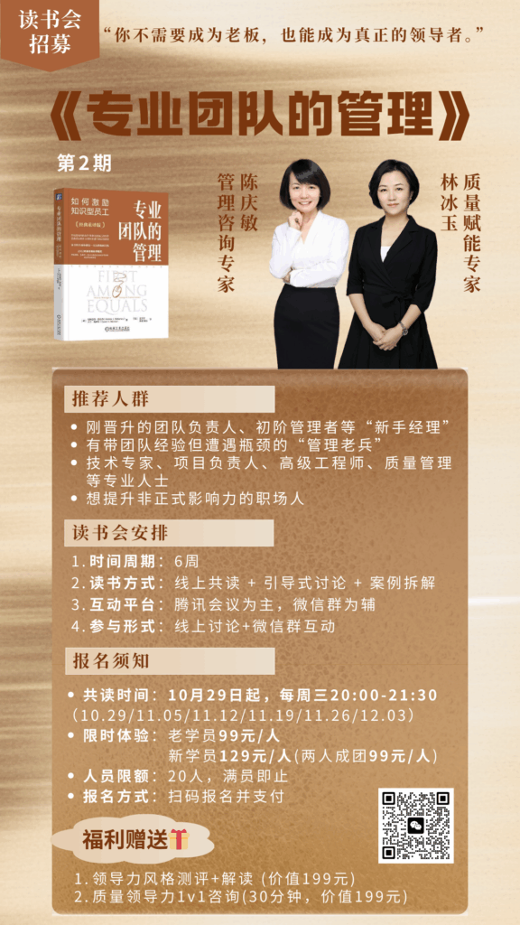 如果你也想让读书做到“学以致用”,不妨从尝试参加读书会开始。聂子和我组织的《专业团队的管理》读书会第二期正在火热招募,欢迎加入。