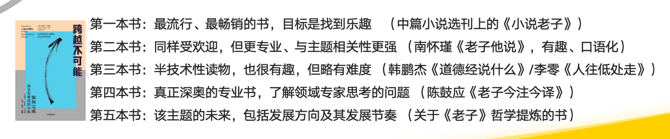 - 第五本书:这本书并不总是最难读下来的(最难的通常是第四本),但通常是最难理解的。因为阅读这本书的目的是直接了解该主题的未来,包括其发展方向及发展节奏。这本书会让你了解最前沿的信息。