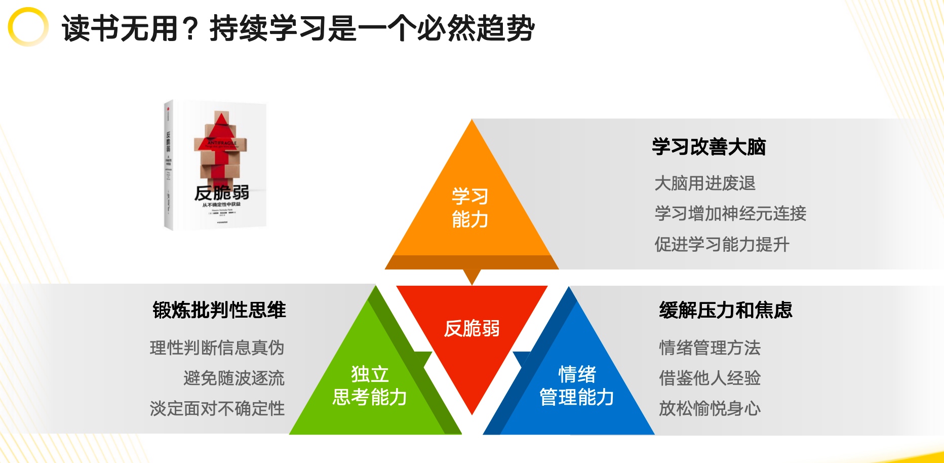 这种想法太普遍了!我们总期望读书能像吃快餐一样,立马见效。但樊登老师在书中提到,在今天这个充满不确定性(VUCA)的时代,读书最大的作用,是建立我们精神世界的“反脆弱”能力。